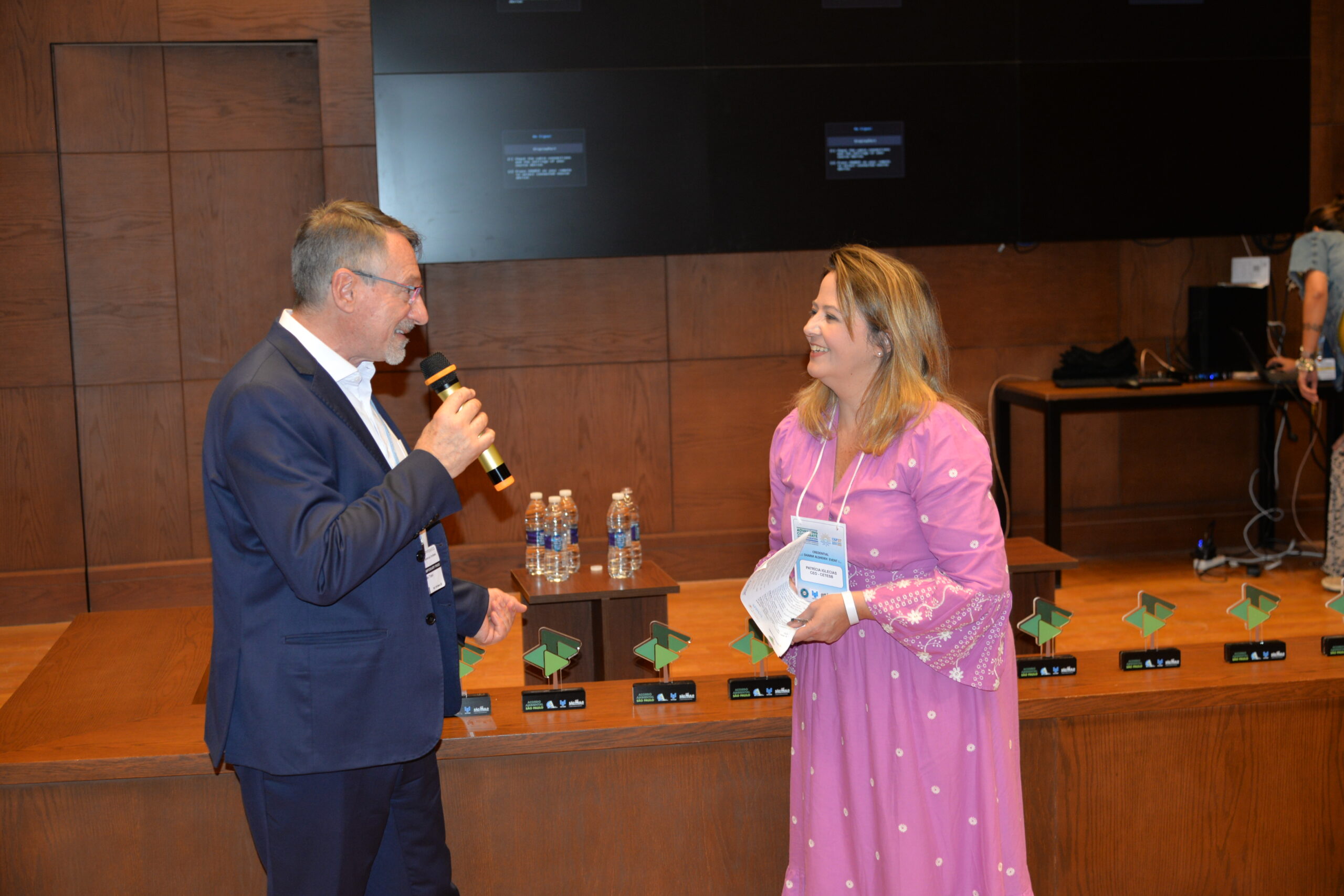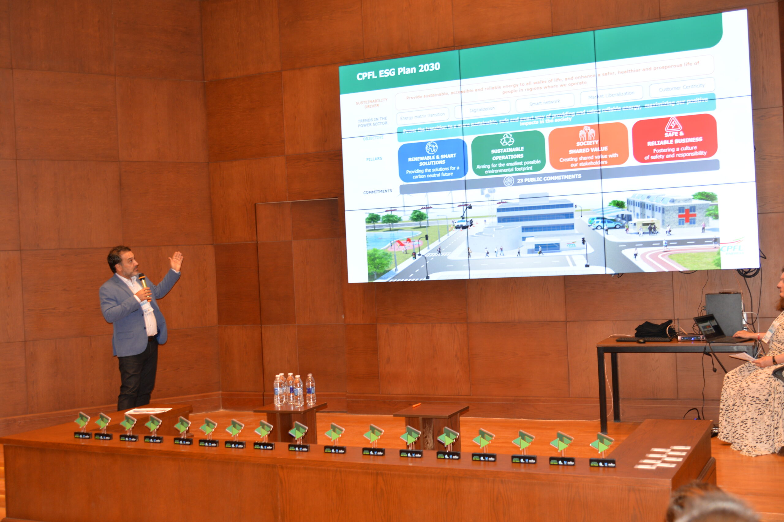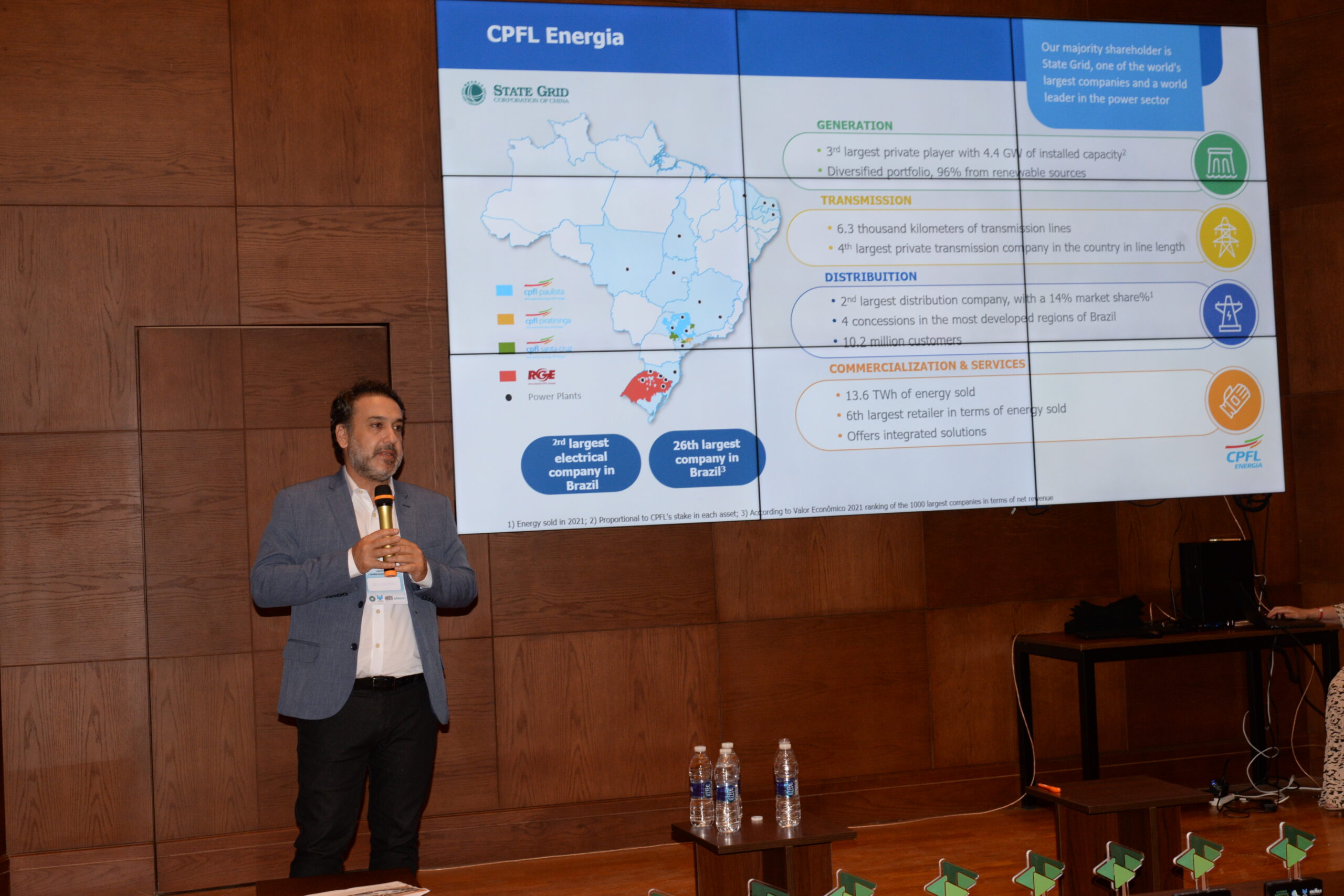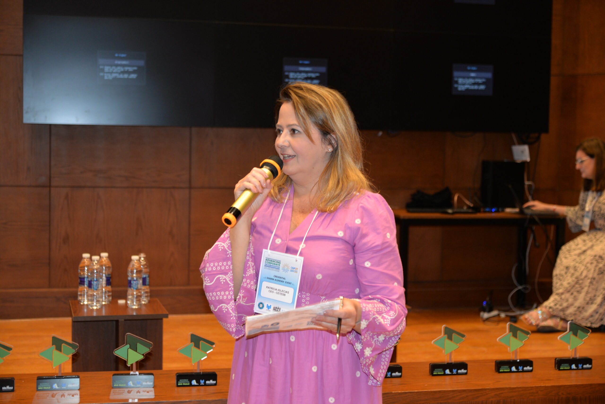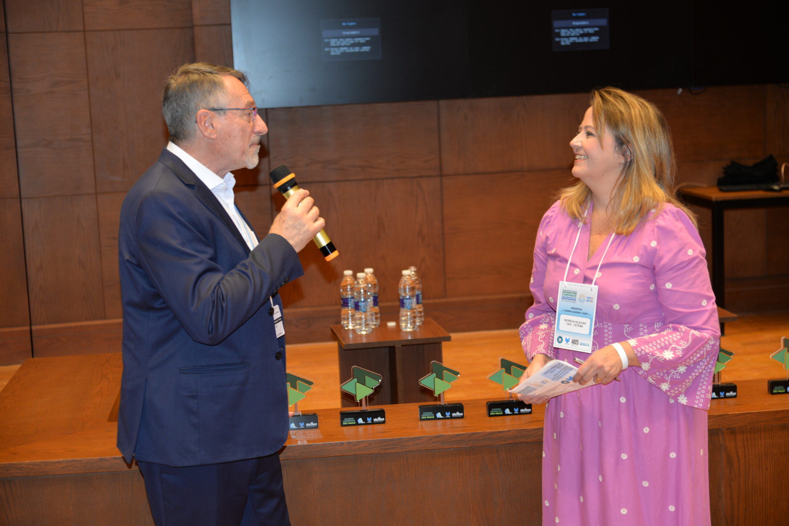 Josilene Ferrer, da CETESB moderou uma mesa que contou com a apresentação de especialistas nas experiências de redução de gases de efeito estufa das seguintes empresas e entidades: Daniel Sobrinho, da Absolar, Plínio Ribeiro da Ambipar, Adriana Mello, da Braskem, Rodolfo Sirol, da CPFL Energia.