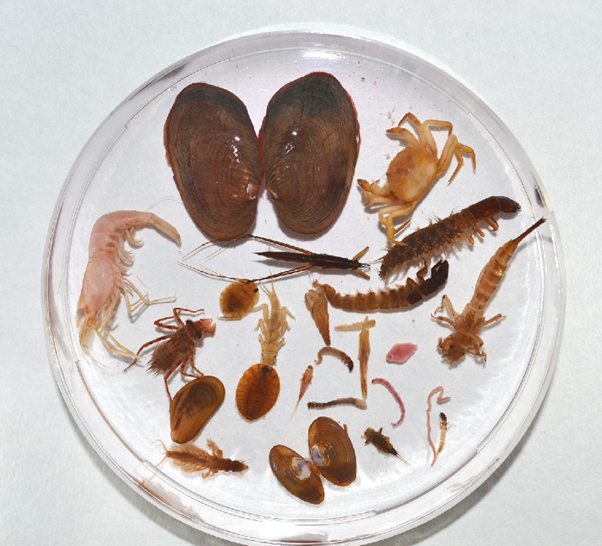 Na análise de Macroinvertebrados Aquáticos ou Comunidade Bentônica são identificados e contados os organismos que colonizam os substratos dos ecossistemas aquáticos, podendo-se avaliar os efeitos ecológicos de modificações químicas (por exemplo: efluentes domésticos e industriais), físicas (desmatamento, assoreamento, extração de areia, construção de barragens), e biológicas (bioinvasão) sobre ecossistemas aquáticos. Também é medida a Frequência de Deformidade em peças bucais (mento) de larvas do díptero Chironomus, alteração morfológica associada aos efeitos danosos de substâncias química provenientes de fontes industriais e agrícolas. Por seu papel bioindicador e sua visibilidade a olho nú, é útil em programas de educação ambiental (Biomonitoramento Participativo).
