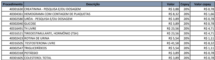 Reiteramos que a coparticipação incide com o percentual de 20% além das Consultas, nos Exames Simples (Analises Clinicas e Anatomopatológicos), a seguir alguns exemplos:
