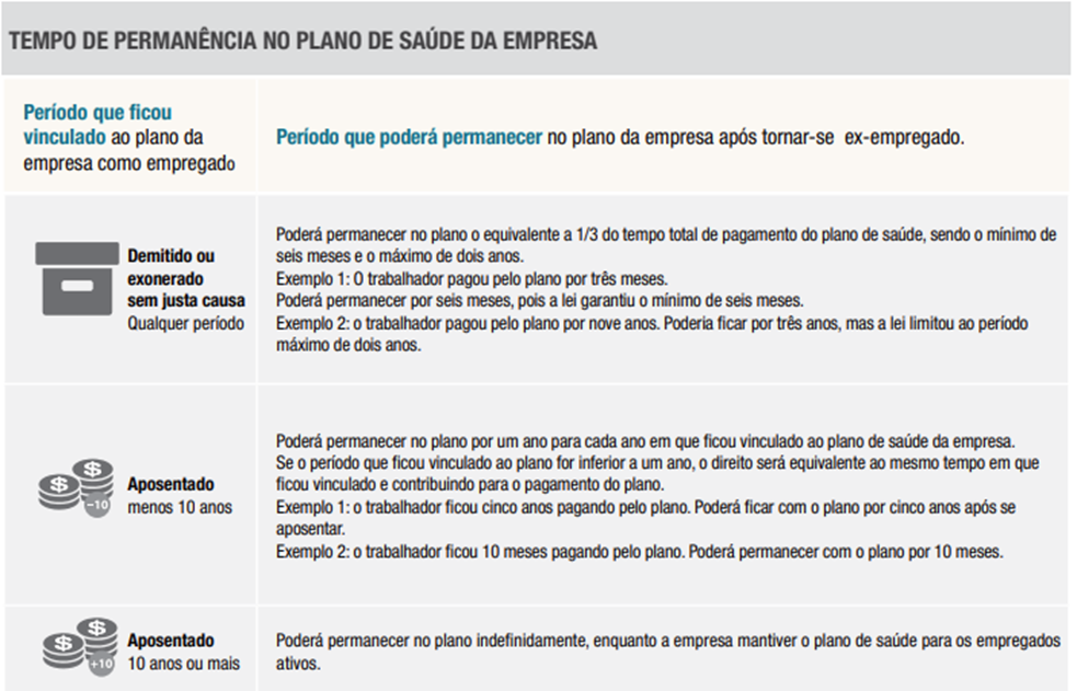 - Demitido sem justa causa: poderá permanecer por 1/3 do tempo de contribuição no plano, sendo no mínimo 6 meses e no máximo 24 meses de permanência.