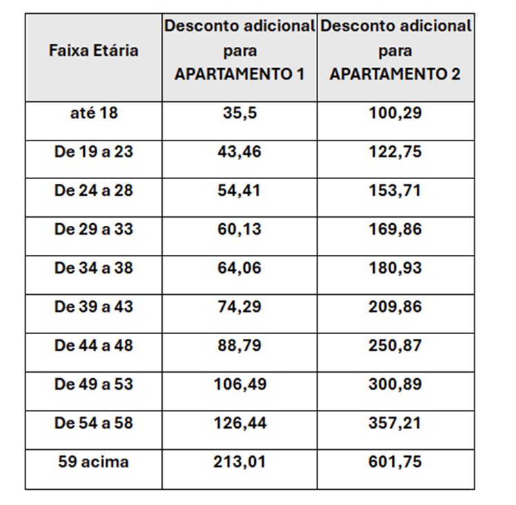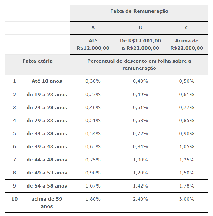 Forma de cálculo: A tabela de desconto é baseada em 3 colunas de faixas salariais e faixas etárias, conforme descrito abaixo: