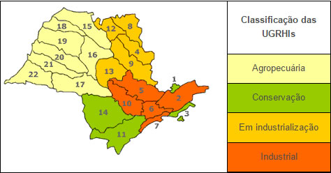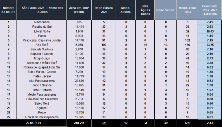 A Cetesb iniciou em 1974 a operação da Rede de Monitoramento de Qualidade das Águas Interiores do Estado de São Paulo. As informações obtidas por meio do monitoramento tem possibilitado o conhecimento das condições reinantes nos principais rios e reservatórios situados nas 22 Unidades de Gerenciamento de Recursos Hídricos (UGRHIs), em que se divide o Estado de São Paulo de acordo com a Lei Estadual n.º 9.034 de 27 de dezembro de 1994. A UGRHI está estruturada no conceito de bacia hidrográfica, onde os tais recursos hídricos convergem para um corpo d’água principal.