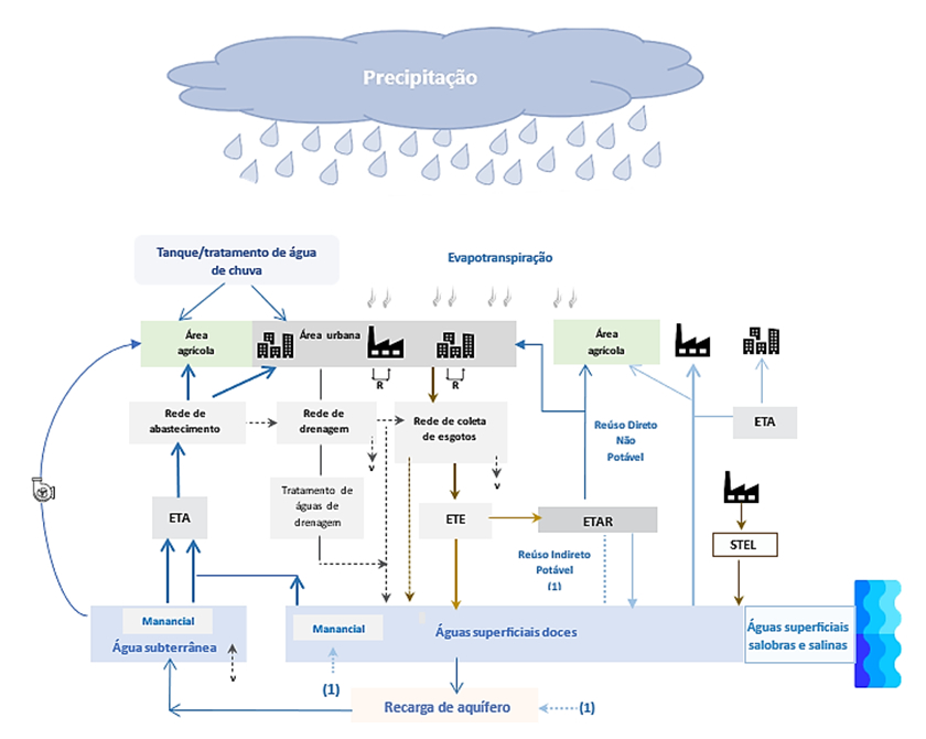 Os usos e reúsos de água ocorrem por meio dos fluxos e acúmulos de água no interior de uma bacia hidrográfica, ou da transferência da água de ou para outras bacias, por meio das infraestruturas antrópicas (saneamento, drenagem urbana, drenagem rural, geração de energia elétrica) e dos compartimentos ambientais (ar, solo, subsolo, álveo dos corpos de água, vegetação).