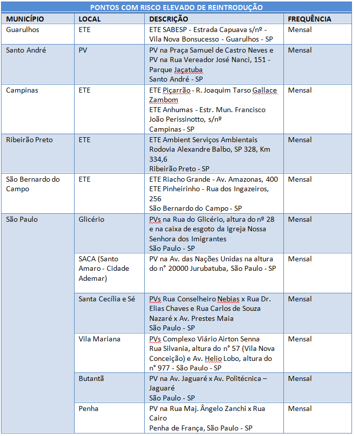 Pontos de coleta de esgoto vigentes no estado de São Paulo para realização de monitoramento ambiental do poliovírus