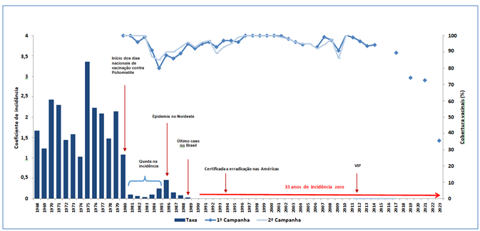Ministério da Saúde. Coeficiente de incidência de Poliomielite e Cobertura Vacinal com a VOP, em Campanhas, Brasil, 1968-2024. 02 setembro 2024. Disponível em https://www.gov.br/saude/pt-br/assuntos/saude-de-a-a-z/p/poliomielite/situacao-epidemiologica/incidencia-de-poliomielite-e-cobertura-vacinal-em-campanhas.pdf. Acesso em 20 novembro 2024.