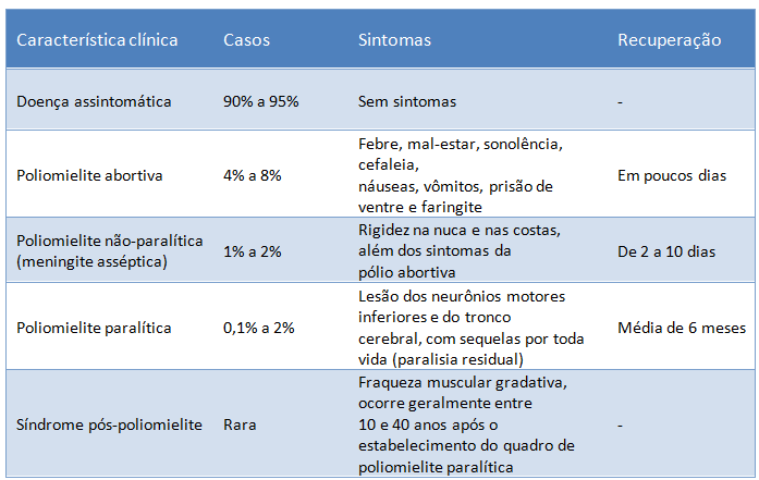 Suspeita-se de poliomielite na presença da síndrome de paralisia flácida aguda (PFA) a qual se apresenta com sintomas bastante característicos, como o aparecimento repentino de dificuldades motoras ou flacidez muscular, principalmente das pernas, com diminuição ou ausência de reflexos na área paralisada, acompanhada de febre.  Além disso, os casos de PFA devem ter histórico de viagem a países com circulação de poliovírus nos últimos 30 dias que antecedem o início do déficit motor, ou contato no mesmo período com pessoas que viajaram para esses países.