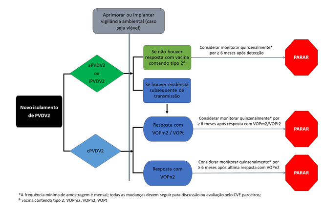 • Aumentar para quinzenal a frequência da coleta de amostras, quando possível, por um período mínimo de seis meses após o isolado mais recente detectado ou o uso mais recente da VOP contendo tipo 2 (no caso de surtos/eventos de alto risco de poliovírus tipo 2), o que for posterior.
