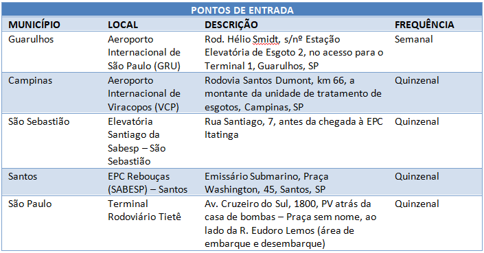 Nos aeroportos internacionais, para definição dos pontos de coleta, a CETESB conta com o apoio da ANVISA e das empresas responsáveis pelo tratamento dos esgotos provenientes das aeronaves e sanitários destinados aos passageiros. No caso da rodoviária, a seleção do ponto de coleta deve incluir os sanitários dos viajantes, e é realizada em conjunto com a empresa gestora do terminal. No caso do Terminal Rodoviário Tietê, trata-se da empresa SOCICAM.