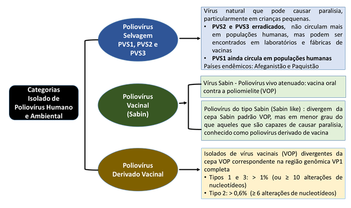 Poliovírus derivados vacinais (PVDV): cepas de poliovírus de vacina que têm > 1% de divergência (≥ 10 nucleotídeos de diferença) para os tipos 1 e 3, e > 0,6% de divergência (≥ 6 nucleotídeos de diferença) para o tipo 2, em relação a cepa Sabin de referência, comparando-se a região do gene VP1.
