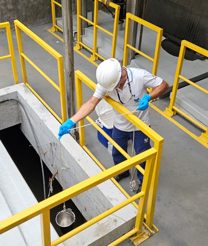 Amostragem em poço de visita da SABESP com fluxo de esgoto