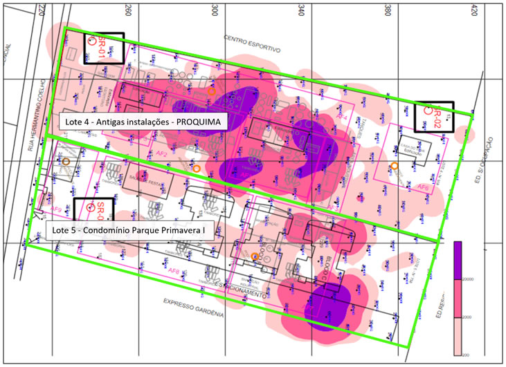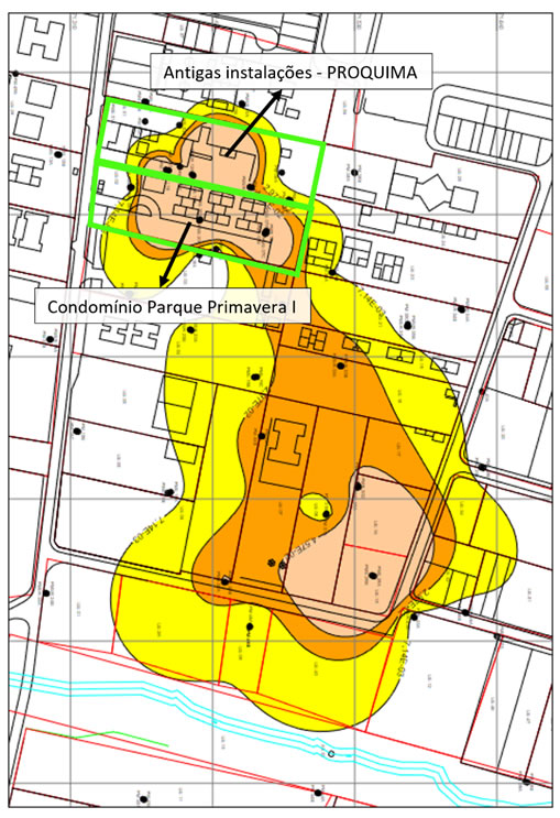 Os resultados da investigação ampliaram o conhecimento sobre o meio físico e a contaminação (Figuras 3 e 4), sendo tomadas ações no sentido de interditar o “playground”, salão de festas e apartamentos do térreo do Bloco A do Condomínio Parque Primavera I.