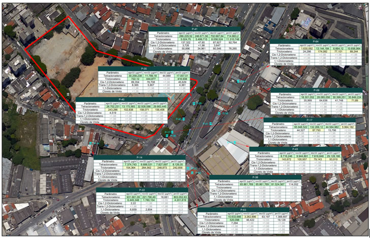 Durante campanha de monitoramento realizada em junho de 2015 nas amostras de ar ambiente coletadas, nas sete construções avaliadas, foram detectadas concentrações de cloreto de vinila superiores às máximas aceitáveis para receptores residenciais definidas naquele momento, e na amostra coletada na propriedade AR-40, foi detectada concentração de tricloroetileno na amostra de ar ambiente superior a máxima aceitável, valores que confirmaram como válido o caminho de intrusão de vapores.