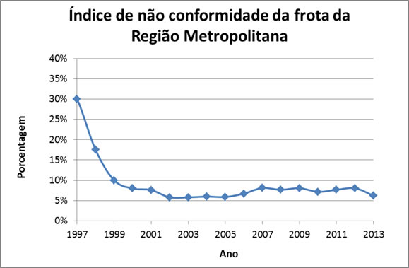 De todo esse esforço, obteve-se significativa melhora na frota diesel em circulação, com o índice de veículos desregulados caindo da ordem de 30% (1997) para cerca de 6% (2013), como mostra a Figura 1, significando que 94% dos veículos diesel em circulação, tem sua manutenção adequada e apresenta emissão de fumaça inferior ao padrão nº 2 da escala Ringelmann.