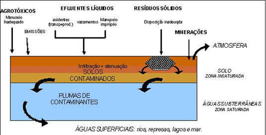 Essa utilização do solo como receptor de poluentes pode se dar localmente por um depósito de resíduos; por uma área de estocagem ou processamento de produtos químicos; por disposição de resíduos e efluentes, por algum vazamento ou derramamento; ou ainda regionalmente através de deposição pela atmosfera, por inundação ou mesmo por práticas agrícolas indiscriminadas. Desta forma, uma constante migração descendente de poluentes do solo para a água subterrâne ocorrerá, o que pode se tornar um grande problema para aquelas populações que fazem uso deste recurso hídrico. A Figura 1 apresenta sucintamente as fontes de poluição do solo e sua migração.
