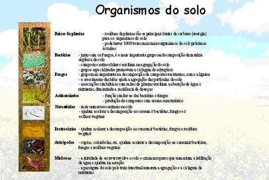 A matéria orgânica (humus) do solo inclui todos os compostos orgânico, exceto os materiais não decompostos e os organismos vivos (biomassa). A matéria orgânica pode ajudar no aquecimento do solo, no suprimento de nutriente para as plantas, permite troca de gases, estabiliza a estrutura e aumenta permeabilidade. Os organismos do solo são responsáveis pelos processos de decomposição.
