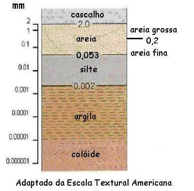 Dependendo da espécie mineralógica que deu origem e dos mecanismos de intemperismo e transporte, o solo apresenta diferentes conteúdos das frações: areias, siltes ou argilas. O tamanho relativo dos grãos do solo é chamado de textura e sua medida de granulometria (escala granulométrica ), para classificação da textura do solos. A Figura abaixo é apresentada a escala de textura utilizada para solo.
