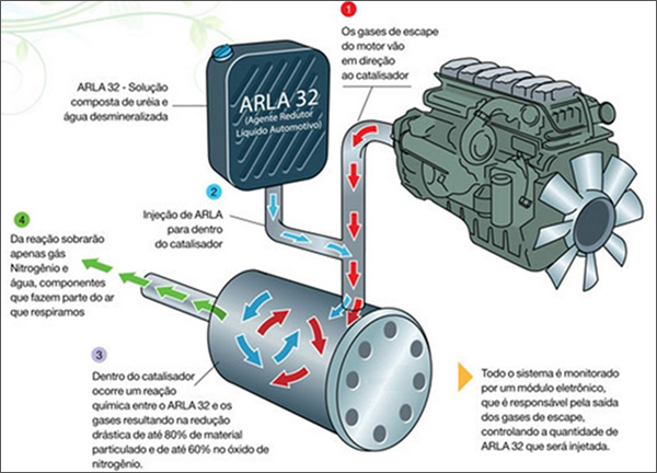Essa solução é injetada no sistema de escapamento dos veículos que possuem tecnologia SCR (Selective Catalytic Reduction/Catalisador de Redução Seletiva) para a redução da emissão de óxidos de nitrogênio (NOx), segundo processo que ocorre pela reação do Arla 32 com o NOx, gerando vapor de água e gás nitrogênio, inofensivos para a saúde humana.